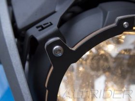The resilient face of the headlight guard is precision cut from impact-resistant polycarbonate ' the same material used in bullet-proof windows. This polycarbonate is formulated with a hardened scratch resistant surface both front and rear. The face attaches to the stainless steel frame with a custom machined aluminum ball and rubber socket connection that provides a sturdy connection free of any vibration. These innovative fasteners make removal of the guard for cleaning a cinch ' no tools required. The polycarbonate guard is also interchangeable with all other versions of the AltRider headlight guard