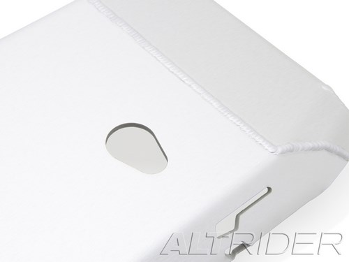 Like the AltRider crash bars, the AltRider skid plate was completely redesigned for the liquid cooled R 1200 GS. To maintain greater ground clearance, a flat plate of 3/16 inch (4.76 mm) anodized aluminum is utilized, with no bolts on the bottom side to snag. This patent pending mounting system allows the move from the AltRider original corrugated design, saving over 1 inch (25.4 mm) of ground clearance. The plate was designed to be extremely narrow at the bottom to maintain the great cornering ability of the bike. It is a one piece unit that provides tire to tire protection. From the leading front corner of the headers to just before the rear tire, the entire bottom side of the motor is shielded from impact. Even the catalytic converter is safeguarded. There are no gaps in protection or plastic pieces to break and no parts to continually repurchase--just one smooth 3/16 inch (4.76 mm) plate that provides complete coverage. In an effort to maintain simplicity, AltRider designed the skid plate so it doesn't require removal to change the oil on the bike