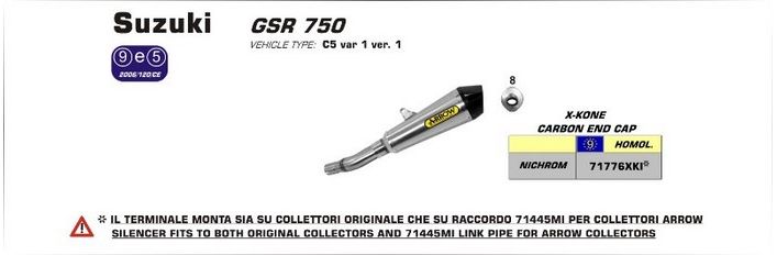 ARROW SUZUKI GSR 750 '11/13 HOMOLOGATED STEEL X-KONE SILENCER WITH CARBON END CAP + LINK PIPE FOR ORIGINAL AND ARROW COLLEC. | 71776XKI