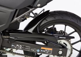 The BODYSTYLE Sportsline Black rear hugger creates racy dynamic outlines in matt black at the rear wheel of sport and naked bikes. This paintable styling part made of high-strength ABS plastics works as splash guard for the central spring leg. With ABE.