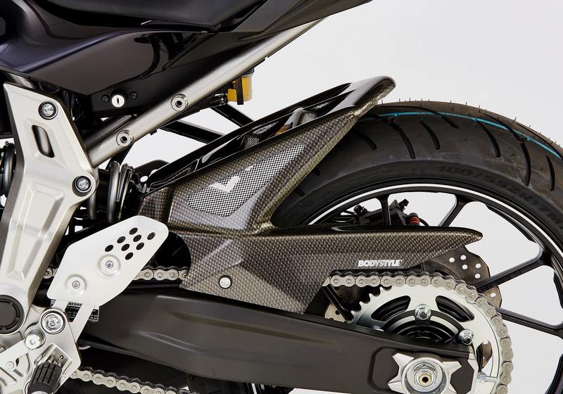 The BODYSTYLE Raceline rear hugger comes with cut-outs at the side, carbon look (paintable) and sporty shape - the ultimate racelook for your sport or naked bike. This styling part made of high-strength ABS plastics works as splash guard for the central spring leg. With ABE.