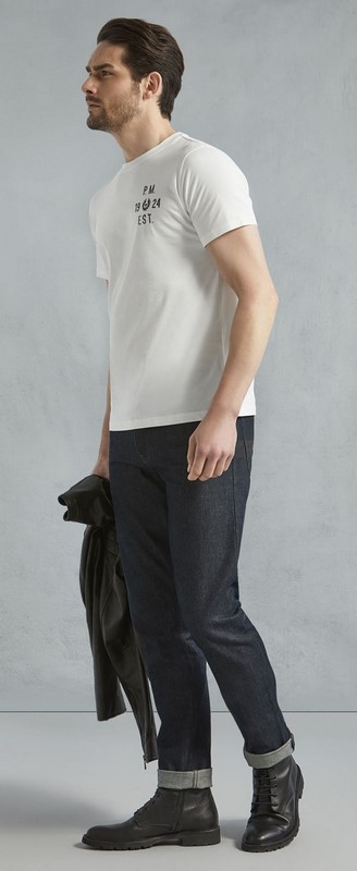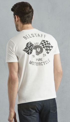 A classic, all-season staple, the McCallen men’s T-shirt, in off-white, is made from soft cotton jersey. The simple design – short sleeves and crew neck – comes with a Belstaff Pure Motorcycle print on the left breast and an oversized flag print on the back.