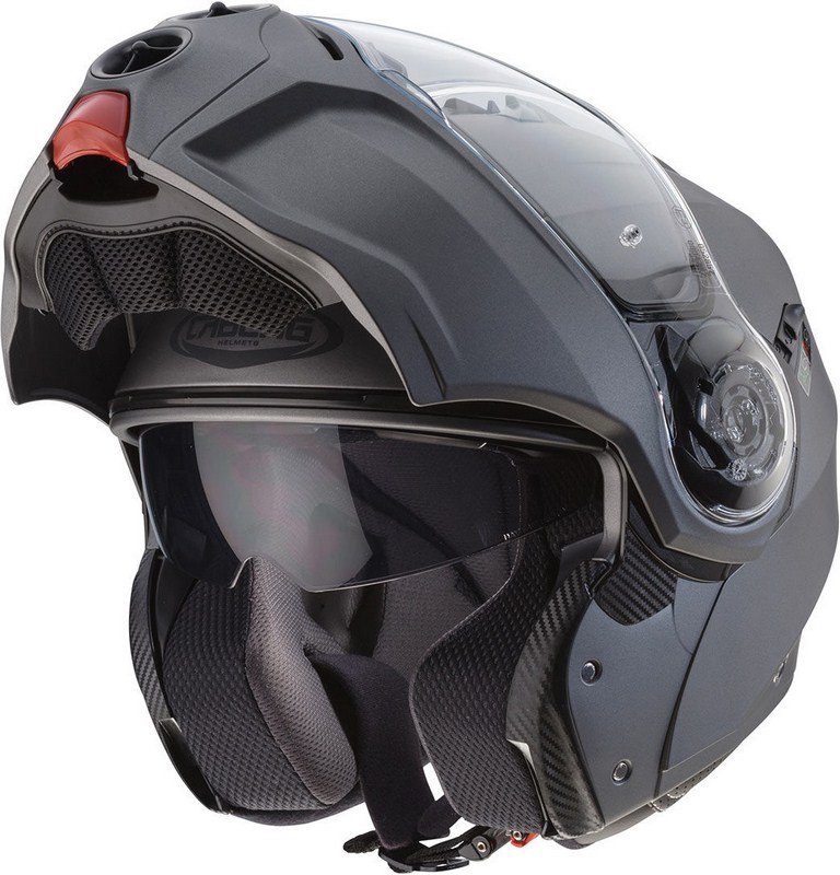 DROID is the result of the gained experience by the first Italian company to produce flip up helmets; It comes with the dual homologation P/J which allows to ride also with the chin guard open, guaranteeing safety thanks to the lever P/J on the left hand side of the helmet. This lever, when in the “J” position, blocks the chin guard in the fully open position avoiding accidental closing.
