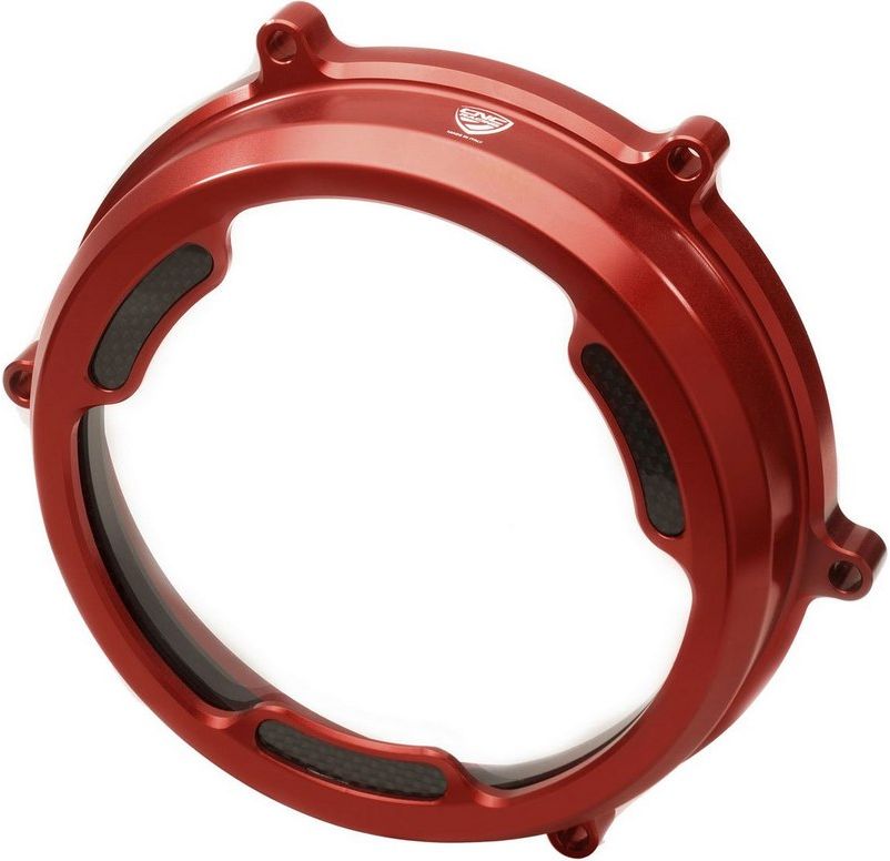 Clear oil bath clutch cover with carbon fiber inlay for Ducati Panigale made in light alloy, machined from solid and then anodized.