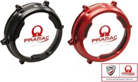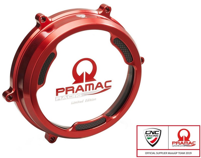 Clear oil bath clutch cover with carbon fiber inlay for Ducati Panigale made in light alloy, machined from solid and then anodized.