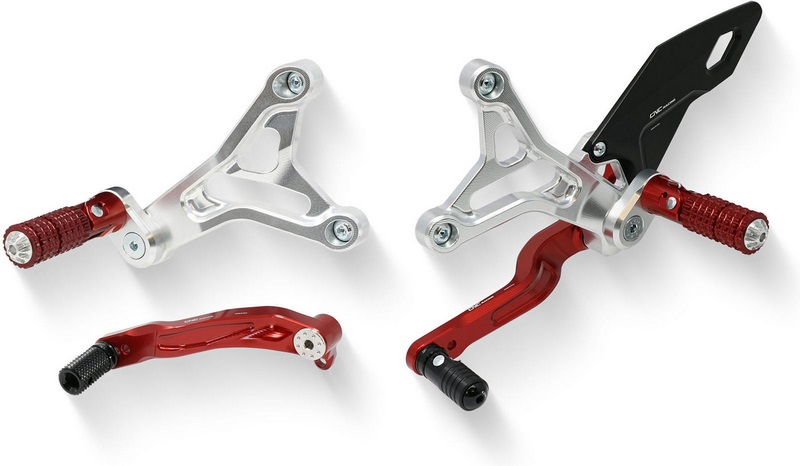 Adjustable rider rearsets made in aluminum machined from billet using CNC machines and subsequent surface anodization.