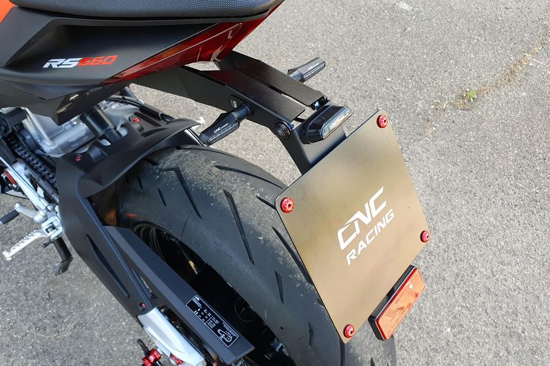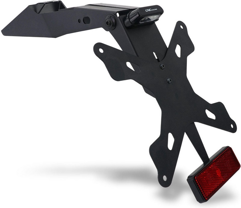 Plate holder adjustable steel including a support plate, license plate light LED, supports arrows reflector.Features:- Connection-specific model of motorcycle including nuts and bolts for quick and easy assembly.- Tilt adjustable thanks to a large-scale settings, you can change the angle of the plate.- Height adjustable plate: the plate can be positioned at various points along its axis until the desired height is reached and measure.- Number plate light LED small approved.- OEM turn signals or our aftermarket blinkers (for the M8 arrows use the mounting plates IDA04B ) can be fitted in the dedicated holes