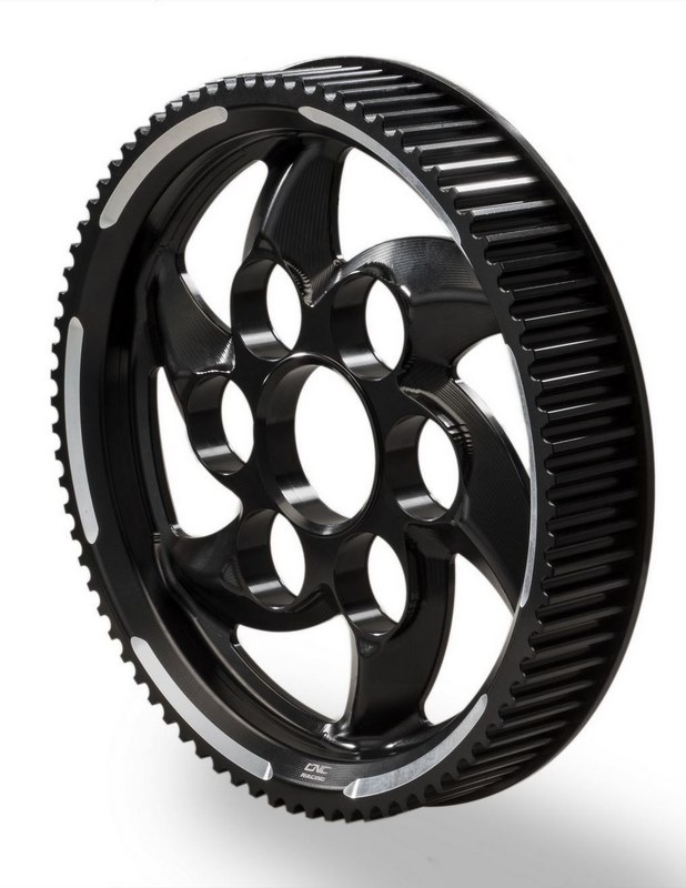 Rear pulley made from a light alloy, machined from billet, with subsequent anodization of the surface. It replaces the original one without modifications.