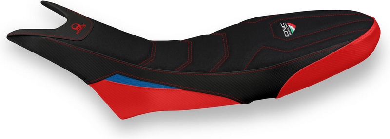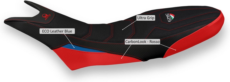 Seat cover made of Eco-Leather UltraGrip black and side layers in Eco-Leather CarbonLook black and red and Eco-Leather blu with reinforced double pointed stitching.