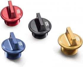 Oil filler cap machined from light alloy billet and then given an anodized surface finish.