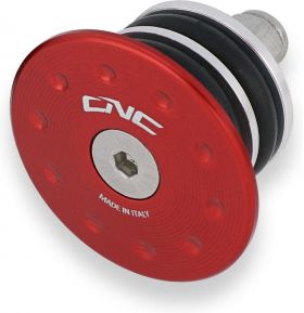 Front wheel axle cap left side machined from light alloy billet and then given an anodized surface finish.
