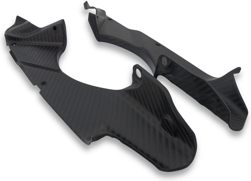 Left and Right Air intake covers made with the exclusive use of Twill carbon fibers 285 gr/sqm for the surface and 630 gr/sqm for the inner side.Matt surface finish.