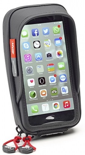 The S957B is the perfect solution for transferring your smartphone on motorcycle, scooter, bicycle, quad etc. The mounting system, compatible with a tubular bar with a diameter between 8mm and 35mm and with the ability to wrap around items that are not perfectly round, enables this model to be used on motorcycles with a handlebar with a diameter of 22mm or on stalks of a rearview mirror.#Thanks to the mounting system, designed and patented by GIVI, to attach and remove the smartphone holder is extremely simple and fast, taking only a matter of seconds. Loosening the handle on the mounting support can adjust the position of the smartphone holder according to the rider’s specific requirements, at any time and without the need for any tools.#The shell has shock-absorbing inserts to protect the device being held. The product is also supplied with a safety strap, sunshade, touch-sensitive front surface, a power supply port and a waterproof cover to be used in the event of heavy rain.#• Saf