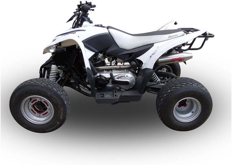 GPR EXHAUST SYSTEM COMPATIBLE FOR AEON AEON COBRA 300 > 2007 0 Full Homologated DEEPTONE INOX exhaust with manifold/header, it has removable db killer (baffle) for racing use. Articles include specific header, brackets, holder and fasteners,kit totally stainless steel made (Aisi 304). Developed from GPR thanks to Moto GP and SBK races experiences, the system has a ROUND D.100, weight about 1,85 kg depending from ATV of destination. GPR provide original homologation documents and instructions available as drawings or video or pictures books. Available many sound file and pictures gallery,product is hand made in Italy, produced under European directives,it is street legal and it has 2 years of international warranty