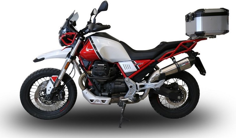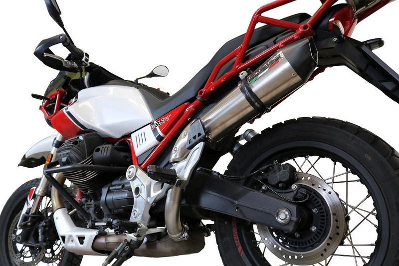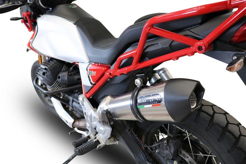 GPR EXHAUST SYSTEM COMPATIBLE FOR MOTO GUZZI V85 TT 2019/2020 0 Homologated new GPE 50° ANNIVERSARY TITANIUM Slip-on kit with removable db killer (baffle) for racing use,it include specific link pipe, brackets, holder and fasteners,pipes stainless steel made (Aisi 304), silencer TITANIUM made, with pentagonal 50° Anniversary exit cap Ergal made end enter cap made with CNC technology. Developed from GPR thanks to Moto GP and SBK races experiences, the system has a conic shape from round to oval,it start with Diam. 96 to 130mm, weight about 1,65 kg depending from motorbike of destination. GPR provide original homologation documents and instructions available as drawings or video or pictures books. If item is used in homologated configuration it doesnt require mapping, it is possible use panniers and central stand and sonda lambda boss is included when necessary. Available many sound file and pictures gallery,product is hand made in Italy, produced under European directives,it is street legal and it has 2 years of international warranty
