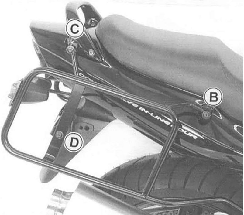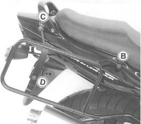 HEPCO&BECKERs standard side carriers are firmly bolted to the motorcycle. All normal hard lugagge cases from Hepco & Becker fit this carrier. The cases are fastened to the carrier by means of a quick release fastener. For this purpose, an aluminum adapter is required which is normally included within the delivery of the case. (Item number: 700114) This aluminum adapter is screwed to the rear right and left of the carrier and offer the holder for the luggage lock.