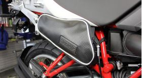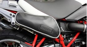 Our under seat bag set is completely manufactured of waterproof material and has a waterproof zipper. You mount the bags with two high-quality Velcro straps and one quick fastener on the backside of your frame. These bags fit exactly to the R1200GS's frame under the rider's seat. The bags offer lots of space where you can store small things, tools and much more.