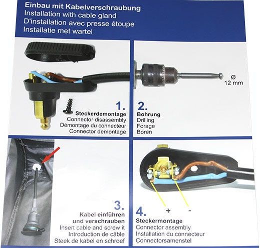 The mounting and unmounting of the plug is very easy. So you can install it pretty fast into your tank bag. You can mount the cabel waterproof and strain-relieved with a drilling of just 12mm.