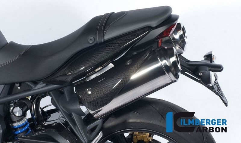 The exhaust heat guard in carbon for the Triumph is made from a special high-temperature pre-preg carbon material in a unique autoclave manufacturing process in order to keep the discolouration of the carbon fibre at a minimum when exposed to the effects of high heat.