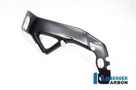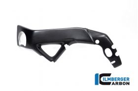The carbon frame cover is attached directly to the frame. It covers the frame and attracts attention. The frame cover is not only convincing visually. Thanks to the high surface quality of Ilmberger Carbon, the frame cover can withstand intensive use over a long period of time. This means that there are no unpleasant work marks on the rough cast surface of the frame either after countless long tours or during daily use of the motorcycle. In order to perfect the high-quality impression, the frame cover not only runs along the vertical frame strut, where the leg rubs, but also extends far upwards, where it disappears under the tight side cover. It is therefore difficult to see from the outside where the frame cover begins and where it ends.