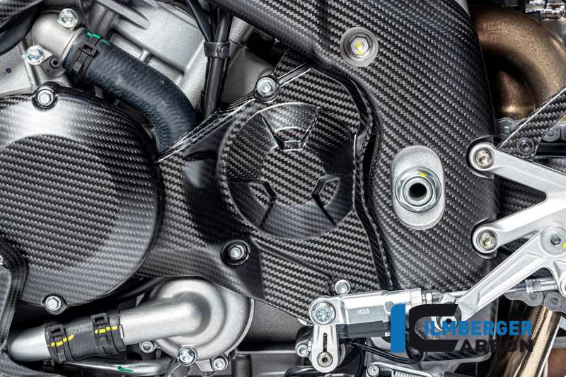 The sprocket cover is one of the most underrated components on the whole motorcycle. Installed centrally on the motorcycle, it surrounds the chain sprocket and does more than it might seem at first glance. It protects the engine and many other components from flying grease while driving. This is particularly stubborn as dirt and difficult to remove from the soft surface of the original part. A hard surface, as it occurs with high-quality carbon, is more suitable here.