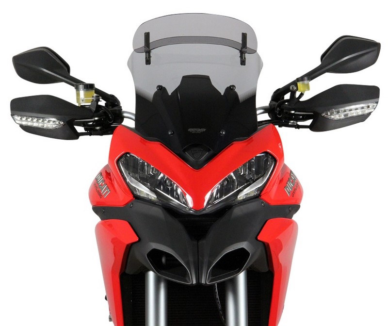 "MULTISTRADA 1200 - Variotouringscreen "VT" 2013-2014" This advanced design of Touring screen has a uniquely mounted spoiler at its rear edge which, without the use of tools, can easily be adjusted into one of seven positions to suit your (and your passenger´s) needs. Positioned on the top rear edge of the screen for maximum effect, the air current is spread out and slowed down, virtually eliminating turbulence. The result is airflow deflected away from the rider to allow a more relaxing, upright riding position, at high speed on long trips. Your passenger can also benefit from the improved airflow as the spoiler position can be injusted to suit their needs too. Available in clear and smoked grey. "MULTISTRADA 1200 - Variotouringscreen "VT" 2013-2014"