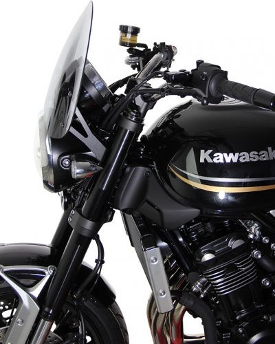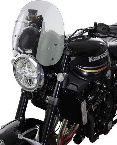 A fine retro bike with 70s-style paintwork, a circular LED-powered headlight, round analogue instruments and an oval rear light – everything in this bike has been selected with care and put together into to create a harmonious whole. We’ve added a matching screen that makes a perfect match for the overall aesthetic. Our screen measures 32 cm in length and 38 cm in width, and comes with angle brackets for attachment to the headlight mounting for a noticeable increase in ride comfort. Available in clear, smoke grey or black.