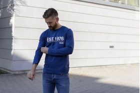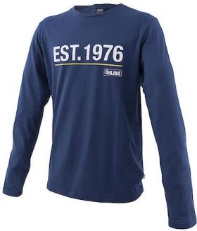 Blue round neck long sleeve t-shirt with EST. 1976 writing printed at the front.