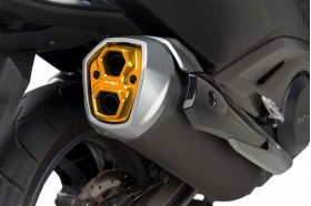 The end ring for the Yamaha exhaust pipe T-MAX 530 (2012 to 2016, T-MAX DX / SX (2017) and Kymco AK550 is part of Puigs Hi-Tech Parts customization catalog. From billet aluminum and featuring a colorful, high-quality anodized finish, its attractive minimalist design is available in blue, black, gold and red, so that each user can choose between a discreet and elegant tuning or a more striking color for these sports maxiscooter.