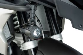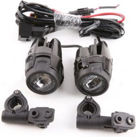 Universal anti-fog LED lights and housing in aluminium painted black. •LED technology with low power consumption, avoiding putting the battery in danger due to excessive consumption. •With instructions to mount on our engine guards. Suitable for engine guards of diameter between 20.5 and 25 mm. •Equipped with fuse and wiring for direct connection to the battery, and waterproof switch to install on the handlebar. •Aluminum housing designed to help heat dissipation. •Optional metallic grill protecting the lenses for Offroad use. They must be ordered separately (Ref.9785N) Technical characteristics: Consumption: 40W (20W per focus) Voltage: DC 12-24V Lumens: 4000L M (2000L M / focus) Material: PC Lenses / Aluminum housing