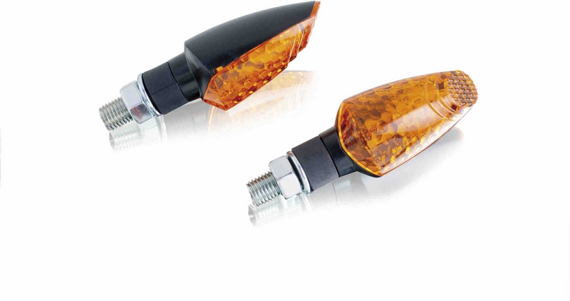 Turn signals TIP by Puig are designed to customize the bike while maintaining its original personality. These are indicators with classic design and technology, with a bulb, black casing and amber glass; their compact dimensions (67,4x29 mm) make them suitable for easy installation on most motorcycles on the market. This set of turn signals is approved and compatible with 12V and 23W lamps and with 12V and 6W lamps, also available through the Puig catalog, both in amber and transparent colors, which are supplied in boxes of 10 units.