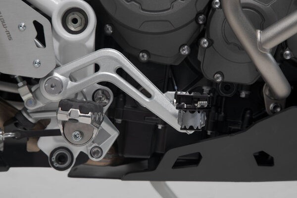 SW-MOTECH manufactures these extensions from high-strength milled aluminum alloy; they feature a black anodized surface and a stainless steel step plate. For optimal ergonomic adjustment, the increase in the brake pedal step can be adjusted in two stages of 22 or 27 millimeters.