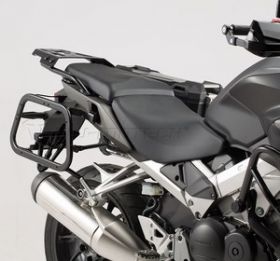 The tough TRAX ADV aluminum cases accept any challenge: Embossed designs add to the stability of the welded aluminum walls with a strength of 1.5 millimeters. The removable lid with anodized aluminum carrying handle and quick release fastener allows easy loading and unloading of the waterproof motorcycle cases. A lateral chamfer on the outer case edge provides ground clearance while cornering. With TRAX ADV aluminum pannier system you are ready for adventure. The complete system consists of the following components: TRAX ADV side cases, EVO carriers, adapters and lock cylinder set at an attractive price. Carrier and case configuration have been carefully selected to complement the motorcycle models tail geometry and exhaust system.