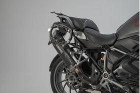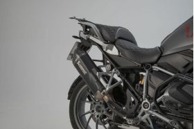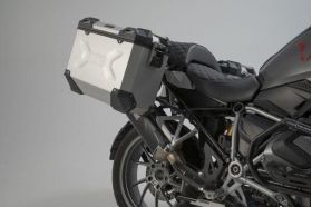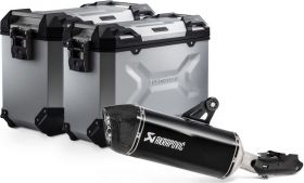 Premium meets premium: In collaboration with Akrapovic, we have created a special set consisting of a TRAX ADV aluminum case system in silver and the matching Akrapovic Slip-On exhaust for the BMW R 1250 GS. The Akrapovic Slip-On improves the performance of the BMW R 1250 GS and offers the typical Akrapovic sound. Moreover, the muffler is well built and simply looks good, just like the SW-MOTECH aluminum case from the TRAX ADV series.With a little skill on your part, you can mount the slip-on system yourself and, together with the aluminum cases, have a high-quality set. Durable TRAX ADV aluminum cases feel at home on any stretch of road: embossed patterns add stability to the 1.5 millimeter-thick, welded aluminum wall material. A completely removable lid with carrying handles made of anodized aluminum and quick release fastener makes loading and unloading motorcycle luggage easier; the beveled side edge provides high ground clearance when taking corners. With this complete solution, you have all the components you need to go on long tours with TRAX: two waterproof TRAX ADV side cases, two removable SW-MOTECH side carriers, adapter kit, lock set, lid limiter and anti-theft protection at an attractive price. The bike-specific carriers and size of the cases are designed to perfectly match the shape of the tail as well as the motorcycle's exhaust system.Don't settle for a compromise when it comes to your motorcycle cases: the development of the TRAX ADV focuses on stability and tightness against dust and water as well as easy handling. Whether on an off-road adventure, road trip or short haul, the premium aluminum case with a wall thickness of 1.5 millimeters will come out on top in any challenge.