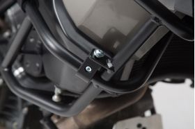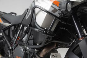 This rugged upper crash bar protects tank and fairing of the KTM 1290 Super Adventure R as well for 1290 Super Adventure S and 1090 Adventure (16-) from scratches and damage in case of an accident, helping to avoid costly repairs. The tough steel construction can easily be mounted to the motorcycles original crash bar. Impact resilient CNC machine milled fastenings, integrated into the steel tubing geometry, provide a safe fit. Rubber inserts reduce vehicle vibrations. The upper crash bar is available in black or orange color, matching the tone of the original crash bar. High grade powder coating provides protection against corrosion.