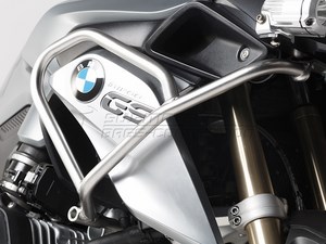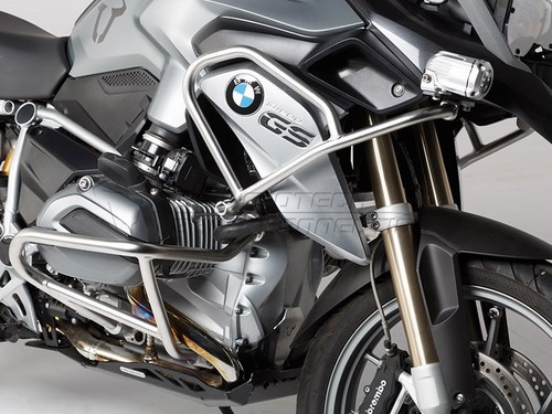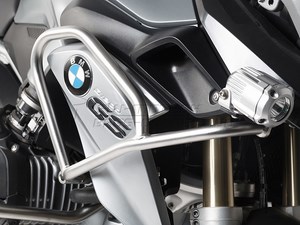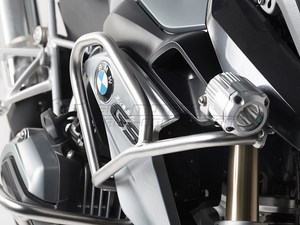 Upper crash bar, made of stainless steel, complementing the original crash guard for BMW R 1200 GS LC bikes built 2013 or later. In addition to supply sturdy and durable protection for the bike’s tank and fairing, during the development process the protective frame’s design and finish have been tailored to exactly match the motorcycle manufacturer’s original crash guard. As a result the upper crash bar, mounted on existing anchor points on the bike’s frame, perfectly fits the elegant long-distance motorcycle’s visual appearance.