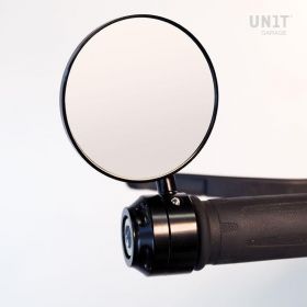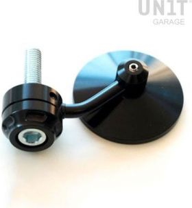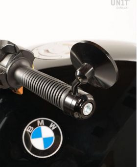 CNC-milled Mirror in black anodized aluminum constructed ad- hoc for the nineT. This single mirror can be mounted on both the right and left side of the handlebar. Mirrors are always a problem for the look of the bike, therefor we chose a very minimalistic look. It comes complete with aluminum bar end and mounting screw ( can not be mounted with the original plastic bar ends )